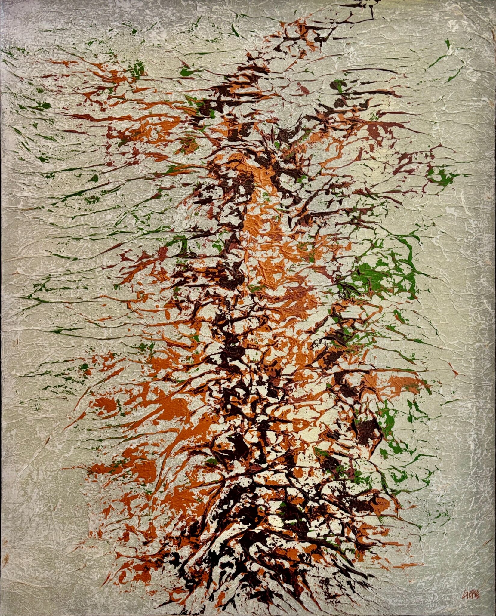 Geppe works primarily with acrylic and layered paper, using fire as a tool and symbol to create worn, ethereal surfaces- exploring the unseen layers beneath human and urban experience.